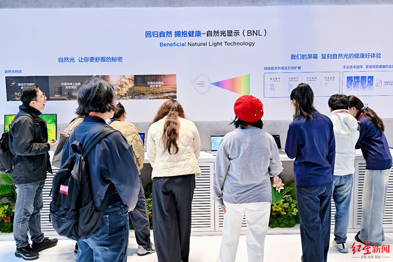 在体验区,京东方展示的“自然光”显示技术,是基于显示屏发出的光线,从振动、光谱、光形和时变四个维度复刻有益自然光特性,使显示回归自然属性,为用户营造出置身大自然般的健康舒适视觉体验。